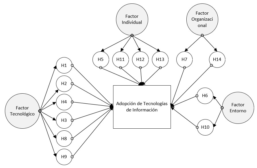 Abstract: Micro and small-sized enterprises (MSEs) employ approximately 60% of the economically active population (EAP) in our country, but only 15% of them have access to information and communication technologies (ICTs). Therefore, it is believed that these companies do not understand ICTs, do not value them or give them due importance and are reluctant to adopt and use ICTs. This non-experimental research aims to find evidence of the relationship between critical factors and the adoption of information technologies in this type of company. To this end, a survey was conducted among 179 businessmen in Metropolitan Lima. Following the evaluation and analysis of the data obtained, it was found that 11 factors have a positive correlation for the adoption of information technologies and 3 are rejected because the significance level obtained is greater than 0.05. Thus, a new model of ICT adoption based on the 11 accepted factors is created for this type of company.