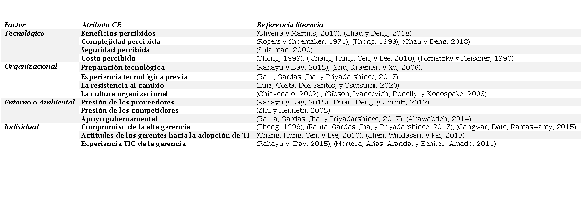 Numerosos estudios empíricos han analizado los atributos críticos de éxito para la adopción de las TIC. En este estudio, se realizó una exhaustiva revisión de la literatura relevante en un esfuerzo por obtener una visión completa del tema y, por consiguiente, definir mejor su alcance. De la literatura revisada se desglosan los atributos presentados en la Tabla 1.