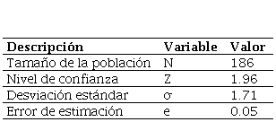 Sobre la base de las 99 477 empresas identificadas, se aplicó la siguiente segmentación tomando como referencia a las empresas industriales que pertenecen a la Zona 4, distrito de La Victoria, de acuerdo a la clasificación APEIM NSE 2020 y que no habían adoptado las TIC. La población estuvo conformada por 186 mypes. La desviación estándar (σ) se calculó con una encuesta piloto a un grupo de 67 encuestados que arrojó como resultado más pesimista 1.71, un margen de error de 5% y un nivel de confianza de 95%.