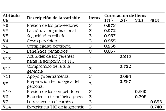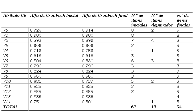 Por el tipo de modelo propuesto en la investigación es necesario trabajar con base en los 14 atributos. En la Tabla 4, se aprecia la consistencia interna de cada uno de ellos, todos los atributos tienen un coeficiente alfa de Cronbach superior a 0.81; es decir, las consistencias internas son las adecuadas.