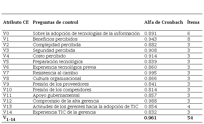 En la encuesta piloto, de los 36 cuestionarios completados, solo 28 fueron válidos. Luego se calculó el Alfa de Cronbach y se eliminaron 13 preguntas porque no alcanzaron el valor esperado. Finalmente, se identificaron 54 preguntas para evaluar la adopción de tecnologías de la información en las mypes industriales de Lima Metropolitana y, adicionalmente, 8 preguntas generales.