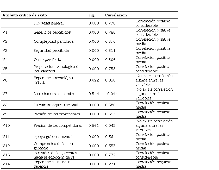 En el caso de los atributos críticos seguridad percibida (V3), costo percibido (V4), cultura organizacional (V8), presión de los proveedores (V9), apoyo gubernamental (V11) y compromiso de la alta gerencia (V12), se observa una correlación positiva media, dado que la correlación resultante oscila entre 0.553 y 0.611. Por tanto, se puede decir que existe una correlación positiva media entre estas hipótesis planteadas y la adopción de tecnologías de la información y comunicación en las mypes industriales de Lima Metropolitana.