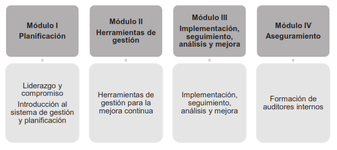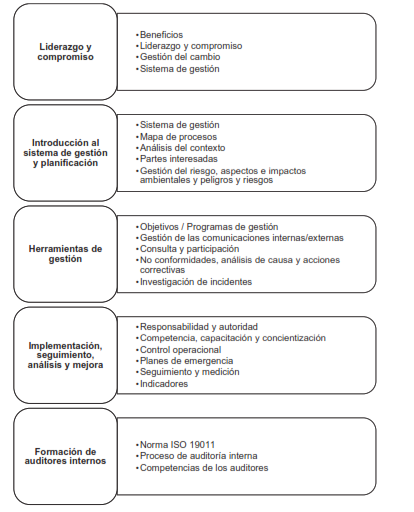 Se cumplió el plazo previsto para la implementación del SG-EHS de 8 meses, aplicando el esquema de implementación modular. Es importante que las organizaciones hayan desarrollado previamente la gestión por procesos, pues ello contribuirá a la articulación de las normas ISO 14001 e ISO 45001 en el diseño del SG-EHS.