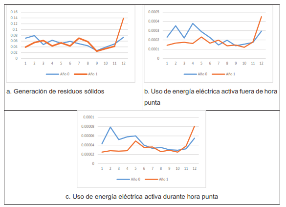 Los indicadores «uso de energía eléctrica activa fuera de hora punta» y «uso de energía eléctrica activa durante hora punta» presentan una reducción del 19.6% y 21.4%, respectivamente (Tabla 4), debido a la sectorización de los sistemas eléctricos, además de la instalación de controladores (timer) para el sistema de alumbrado interno y externo. Se encontró una diferencia significativa entre los años de evaluación (Tabla 8), a pesar de que en el mes de diciembre de ambos años hubo picos (Figura 4.b y 4.c), lo que se puede explicar por los ciclos de facturación de la empresa de energía eléctrica que no coinciden con la programación mensual de producción. Los resultados favorables de los tres indicadores de desempeño ambiental concuerdan con lo hallado en los estudios de Franco y Arias (2018) y Tlapa et al. (2009).