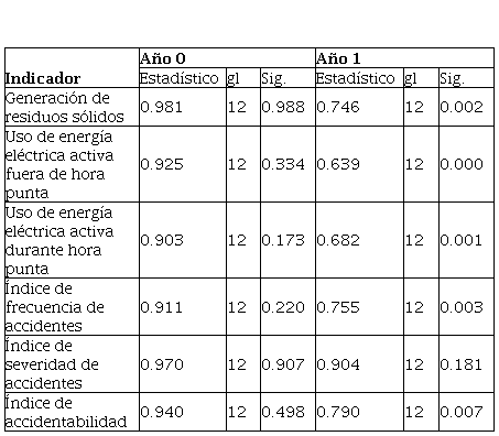 Se aplicó la prueba de normalidad de Shapiro-Wilk (Tabla 7), con la que se determinó que los datos del año 0 son normales para un nivel de significancia del 5%, lo que difiere de los datos del año 1. Se concluyó que los datos no son normales, por tanto, se aplicó la prueba no paramétrica de Wilcoxon (Tabla 8) y se establecieron las siguientes hipótesis: