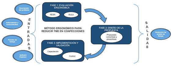 El método desarrollado en el presente estudio se basa en la integración de técnicas ergonómicas para reducir el riesgo de TME en los operarios de la pyme de confección textil tras la implementación de medidas preventivas y correctivas. En la Figura 1, se muestra el método propuesto. La contribución de los métodos REBA y RULA consiste en evaluar la situación antes y después de las mejoras y comparar los puntajes obtenidos para identificar los resultados.