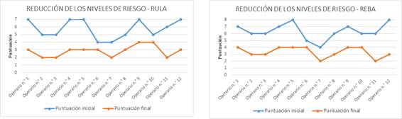 Tras aplicar el método desarrollado, se consiguió reducir considerablemente el riesgo de TME en el taller de confección, los resultados numéricos evidencian una disminución general del 44.97%; los resultados comparativos se pueden apreciar en la Figura 2. Esto coincide con Miranda y Sáenz (2020), quienes utilizaron evaluaciones ergonómicas tales como RULA, REBA y NIOSH, y lograron una reducción del 44.42% del TME presente en las áreas de Remalle, Tendido y Abastecimiento de rollo.