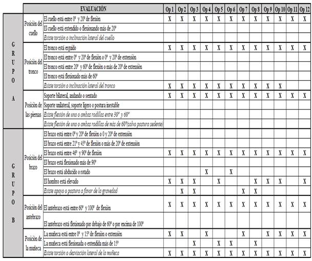 El método de evaluación rápida de todo el cuerpo (REBA) fue desarrollado de manera conjunta por un grupo de ergonomistas, enfermeras y fisioterapeutas tras concluir la identificación y análisis de aproximadamente unas 600 posturas diferentes. Este método nos brinda la posibilidad de analizar de manera conjunta los miembros superiores, que incluyen la muñeca, el antebrazo y el brazo, así como también el cuello, el tronco y los miembros inferiores. La ventaja de este método reside en la consideración de la actividad muscular y el tipo de agarre. El REBA toma en cuenta cinco (5) niveles de riesgo, los cuales van desde «insignificante» hasta «muy alto». Uno de los requisitos necesarios para realizar esta evaluación es el permiso del trabajador, dado a que los evaluadores deben obtener la información necesaria sobre los trabajos realizados. Esta observación puede realizarse de manera directa o mediante la grabación de videos y fotografías (Hita et al., 2020)