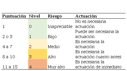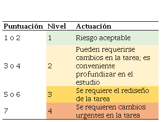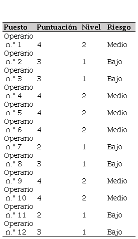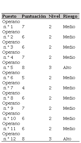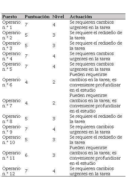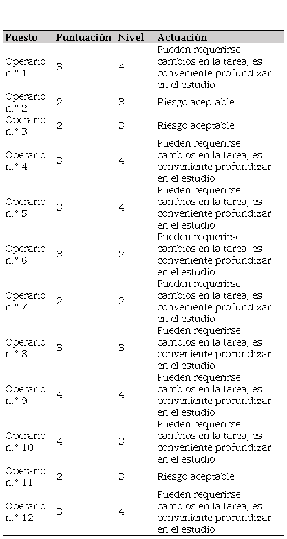 Después de obtener la puntuación y nivel de riesgo de cada operario, se revisó el nivel de actuación según Ergoniza (Tabla 4).