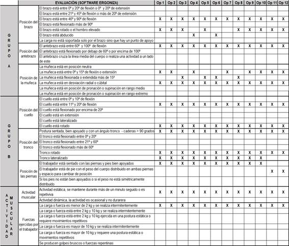Se utilizó la observación directa para seleccionar las actividades que se tomaron en cuenta para el estudio ergonómico, y también se aplicaron los cuestionarios REBA y RULA proporcionados por el software Ergoniza para evaluar el nivel de riesgo de sufrir TME en los operarios.