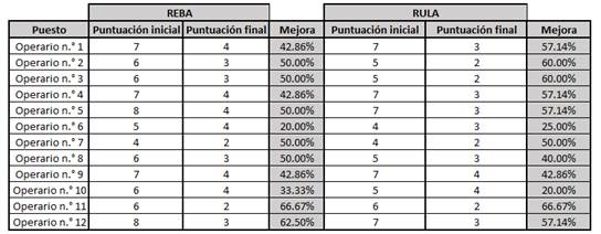 Con el fin de evaluar la eficacia del método ergonómico propuesto, se evaluó la mejora respecto a las puntuaciones obtenidas en la primera y segunda evaluación. Para hallar la mejora, se empleó el indicador RE (reducción de TME) que se halla mediante la siguiente fórmula: