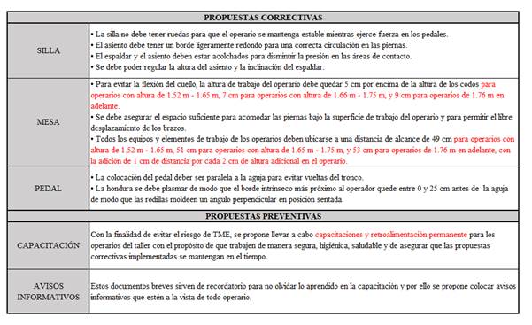 Tras los resultados de la evaluación ergonómica se elaboraron una serie de medidas correctivas y preventivas para reducir el riesgo latente de TME, estas se muestran en la Tabla 8.