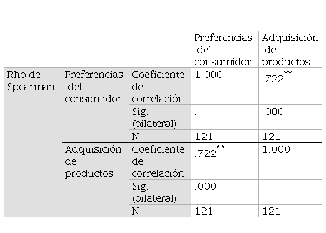 Los resultados demostraron que existe una correlación positiva alta de .722 con un nivel de significancia de .000, por lo tanto, se acepta la hipótesis alterna que sostiene que las preferencias del consumidor se relacionan con la adquisición de productos durante el periodo de pandemia en Lima Metropolitana.