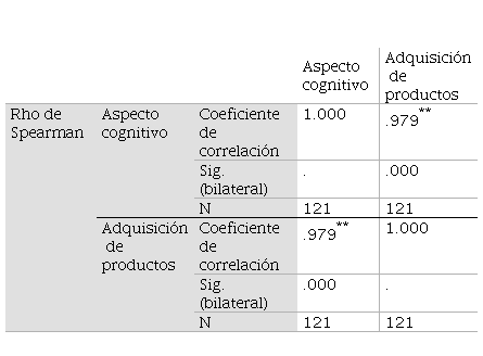 Los resultados demostraron que existe una correlación positiva muy alta de .979 con un nivel de significancia de .000, por lo tanto, se acepta la hipótesis alterna que sostiene que sí existe una relación entre el aspecto cognitivo y la adquisición de productos.