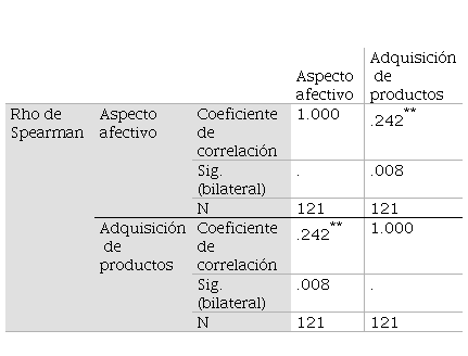 Los resultados demostraron que existe una correlación positiva baja de .242 con un nivel de significancia de .000, por lo tanto, se acepta la hipótesis alterna que sostiene que sí existe una relación entre el aspecto afectivo y la adquisición de productos.