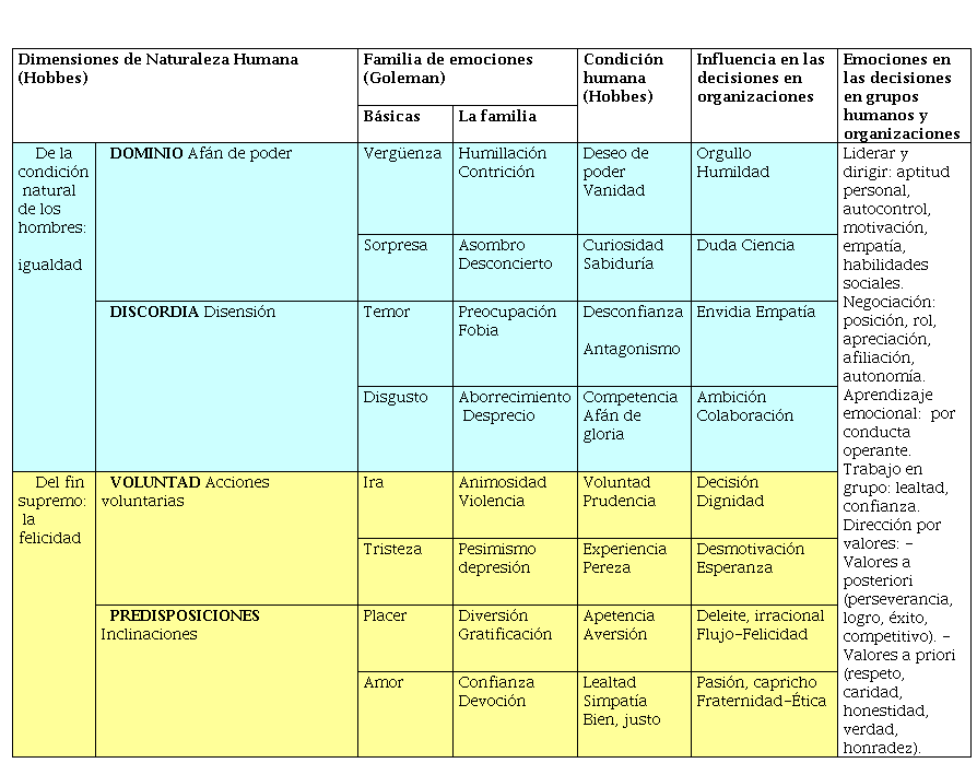 · Decisiones por emocionalidad controlada o del yo emocional. En la decisión emocional controlada se aplican paradigmas conceptuales que agregan racionalidad a las emociones, de manera que la elección toma en cuenta las consecuencias o efectos de la decisión, además del pragmatismo o utilitarismo prevaleciente en las organizaciones. Las decisiones emocionales son de impulso, las decisiones racionales son de reacción tardía. El esquema de emociones, con la condición humana y su propósito se muestra en la Tabla 1.