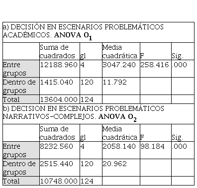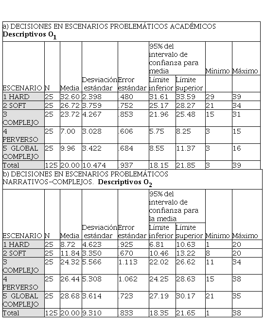 3º) Cálculo de F: la Tabla 2 presenta los descriptivos de las decisiones según los escenarios problemáticos (académicos en parte a, narrativos complejos en parte b). La tabla señala la orientación hacia decisiones racionales o decisiones metaracionales (emocionales). La Tabla 3 indica la corroboración de hipótesis nula para la parte b, donde la prueba F se encuentra en región de rechazo.