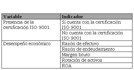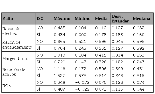 Por el contrario, autores como Mahmood et al. (2014) determinaron que no existe variabilidad representativa en los ratios financieros luego de aplicar la norma ISO 9001. Estos autores seleccionaron las variables de rentabilidad, flujo de caja y tamaño de empresa para este análisis. Como resultado, hallaron que no hay asociación significativa con la certificación. Del mismo modo, Ochieng et al. (2015) concluyeron que, respecto de la rotación de activos e ingresos netos de una empresa, aquellas que cuentan con la certificación ISO 9001 no presentan una ventaja significativa respecto de las que no cuentan con ella. En este estudio se utilizó la prueba . de Student para muestras independientes.