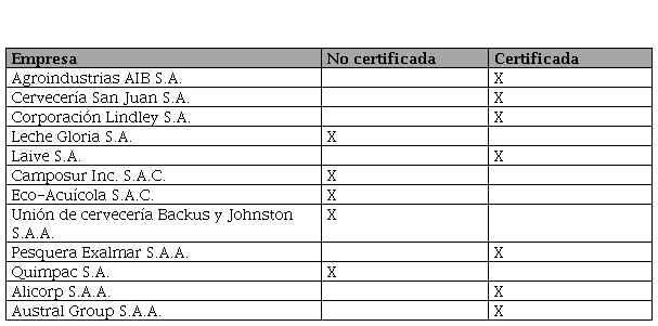 De acuerdo con el objetivo de la investigación, las compañías consideradas se dividieron en dos grupos para ser comparadas: empresas que cuentan con la certificación ISO 9001, que constituyen el 58% del total, y empresas que no cuentan con dicha certificación, que constituyen el 42% restante. Esta división se ejecutó considerando la información proporcionada por diversos reportes encontrados en la base de datos de la BVL. En la Tabla 2, se detalla el listado de organizaciones consideradas y si sus procesos siguen o no los lineamientos de la norma internacional de calidad.