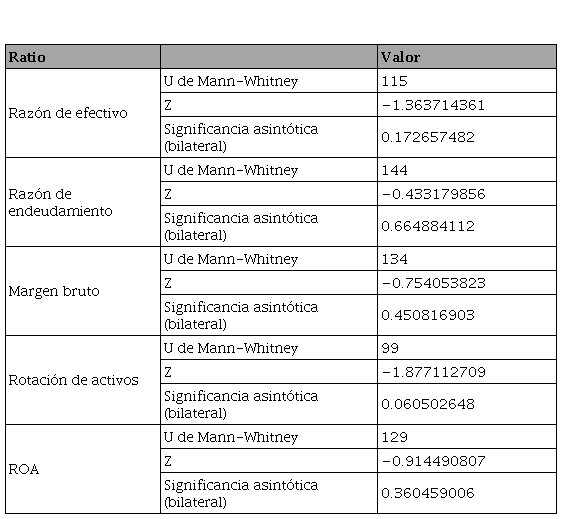Dados que los ratios analizados miden distintos aspectos financieros como el endeudamiento, liquidez y rentabilidad, se realizó la misma prueba, pero analizando el impacto de la ISO 9001 en cada uno de los indicadores por separado. En la Tabla 6, se muestran los resultados obtenidos, en los que nuevamente no se encontró diferencias significativas (p > 0.05). Sin embargo, la significancia de la rotación de activos se aproxima al valor esperado y, tomando en consideración la definición financiera de la misma, se puede considerar que existe una diferencia a favor de las empresas que cuentan con la norma internacional de calidad.