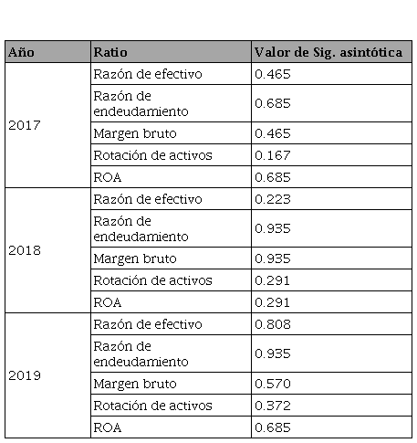 Asimismo, se comprobó si existían diferencias a largo del tiempo, por lo que la prueba se realizó con una separación que consideraba los tres años de estudio. En la Tabla 7, se detallan los valores de la significancia asintótica y se obtiene que en ninguno de los casos este valor es menor al p valor de 0.05. No obstante, se observa que en algunos ratios el nivel de significancia se encuentra más cercano que otros, por lo que se ratifica que sí existen variaciones con relación al tiempo.