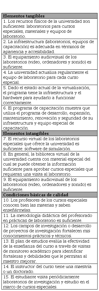 La presente es una investigación aplicada con diseño experimental, explicativo y causal. Para entender a los estudiantes, se consideró necesario tomar una muestra representativa de los mismos. Se realizó un cuestionario que incluyó preguntas relacionadas con los elementos tangibles, los elementos intangibles y las condiciones básicas de calidad, los cuales fueron relacionados con la no insatisfacción de la calidad de la enseñanza de procesos para ingeniería en una universidad privada del Perú.