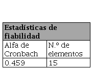 Para evaluar las variables, se elaboró un cuestionario con las tres variables y 15 preguntas específicas (Tabla 1), el cual fue evaluado por 15 participantes. El alfa de Cronbach resultante fue de 0.459 (Tabla 2), con nivel moderado, lo cual respalda el diseño del cuestionario. El cuestionario fue distribuido por Internet.