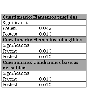 A continuación, se enuncia la hipótesis a probar: Los elementos tangibles de los laboratorios tienen un efecto significativo en la no insatisfacción de la calidad de la enseñanza de procesos para ingeniería en una universidad privada del Perú. Para el contraste, se utiliza la Prueba U de Mann-Whitney para muestras independientes (grupo experimental y de control), considerando las respuestas del cuestionario «Elementos tangibles» (Tabla 4):