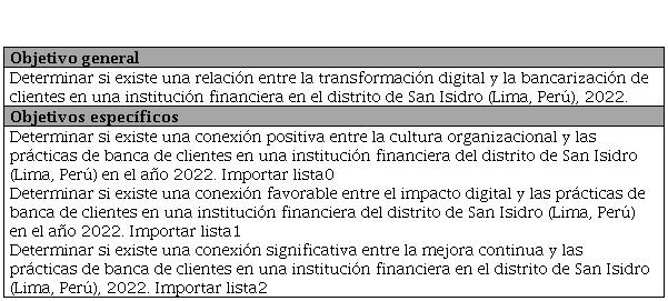 Sobre la base de lo mencionado previamente, la investigación tuvo como propósito determinar la relación que existe entre la transformación digital y la bancarización de clientes en la entidad financiera objeto de estudio. Para realizar un análisis más específico, la variable 1 (transformación digital) fue subdividida en tres dimensiones: cultura organizacional, impacto digital y mejora continua; así mismo la variable 2 (bancarización) también fue subdividida en tres dimensiones: cartera de pasivos, cartera de activos y servicios bancarios. Como objetivos específicos, se buscó analizar la relación entre la variable 2 con cada una de las dimensiones de la variable 1.