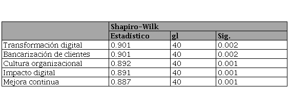 Desde la perspectiva de la cantidad de elementos considerados en la muestra, por ser menor a 50, se utilizó la prueba Shapiro-Wilk para las variables de estudio. A continuación, en la Tabla 2 se detallan los resultados obtenidos.