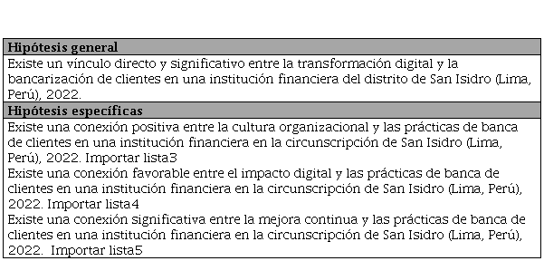 En la Tabla 3, se presentan las hipótesis planteadas para el trabajo de investigación.