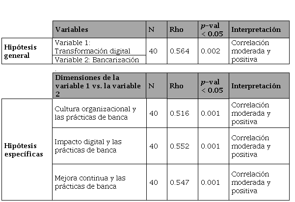 A partir de los resultados encontrados, la hipótesis alterna general es aceptada y corroborada a través de la prueba de Rho de Spearman, la cual obtuvo un coeficiente de 0.564 con un valor de significancia de 0.002, lo cual significa que la relación es positiva. Asimismo, Vargas (2021) coincide en que la transformación digital se relaciona con la bancarización. El estudio analizó las variables «penetración de la banca digital» e «inclusión financiera» y obtuvo un coeficiente de correlación Pearson positivo alto de 0.982 y una significancia de 0.000. En ese sentido, Vargas aceptó su hipótesis alterna: La banca digital tiene un vínculo significativo con la inclusión financiera. Recomendó además relacionar dicho proceso con el cambio cultural, la tecnología y los recursos humanos.