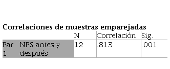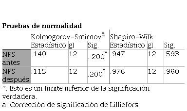 Dado que el valor de p es mayor que 0.05 en ambos casos, tanto para el «NPS antes» como para el «NPS después», se puede afirmar que exhiben una distribución normal, por lo que se utilizó una prueba paramétrica.
