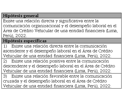 Antes de efectuar la contrastación de las hipótesis, en la siguiente Tabla 3 se expone cada una de ellas: