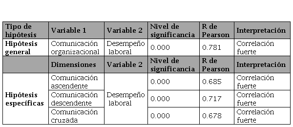 Los resultados obtenidos en este estudio son altamente significativos, ya que revelan una correlación sólida y significativa entre las variables comunicación organizacional y desempeño laboral; el coeficiente de correlación positivo y el nivel de significancia (p < 0.05) respaldan la conclusión de que existe una relación estadísticamente significativa entre estas dos variables. Al examinar la intersección de las dimensiones de la variable 1 (comunicación organizacional) y la variable 2 (desempeño laboral), se encontraron correlaciones que se consideran fuertes según la escala de interpretación propuesta por Salkind (2022), la misma que proporciona una guía para evaluar la fuerza de la correlación, lo que permite comprender mejor la magnitud de la relación entre las variables. En síntesis, estos hallazgos respaldan la relación positiva entre las variables estudiadas.