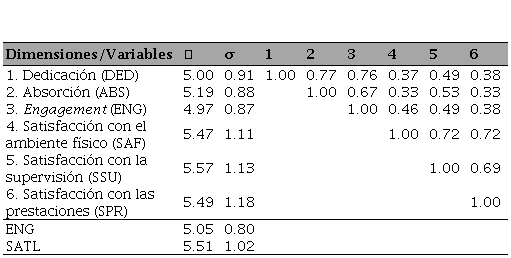 Los estadísticos descriptivos, incluyendo las correlaciones entre las dimensiones de las variables engagement (ENG) y satisfacción laboral (SATL), se presentan en la Tabla 1. En el caso del ENG, la dimensión absorción presentó los puntajes más altos, mientras que, en el caso de la SATL, el puntaje más alto se observó en la dimensión agrado con la supervisión. Sin embargo, en ambos casos se observó una baja variabilidad. Los trabajadores presentan un alto nivel de ENG, ya que la media oscila entre 4.67 y 5.50 (Schaufeli y Bakker, 2011, p. 33). Del mismo modo, presentaron un alto nivel de SATL, ya que la media oscila entre 4.61 y 5.80 (Palomo-Vélez et al., 2015).