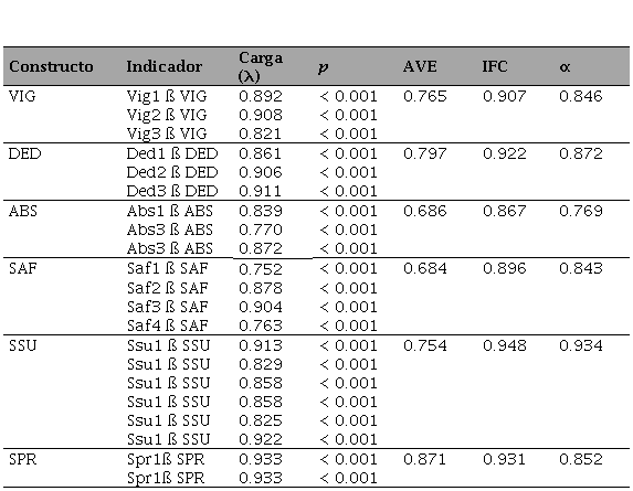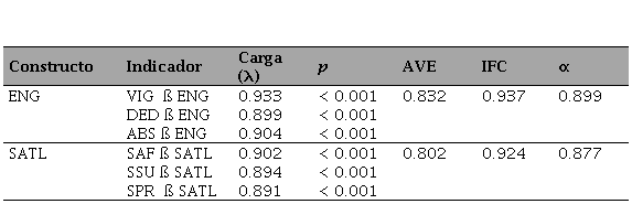 En segundo lugar, se evaluaron los constructos de segundo orden ENG y SATL, como se observa en la Tabla 3. Los resultados indican que las dimensiones de estos constructos también muestran la fiabilidad, puesto que todas sus cargas (λ) asociadas son estadísticamente significativas (p < 0.01). De igual manera, estos constructos presentaron dos tipos de validez: discriminante y convergente, ya que los índices cumplen con los criterios pertinentes (AVE ≥ 0.5; IFC ≥ 0.6; α ≥ 0.6).