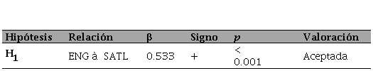 Los resultados mostrados en la Tabla 4 confirman la hipótesis del estudio, por tanto, se puede afirmar que el constructo ENG ejerce una influencia significativa y positiva sobre la SATL. Esta influencia es especialmente relevante, debido a que su coeficiente path o beta revela una fuerte relación al superar el valor de 0.30 y ser altamente significativo (p < 0.001).