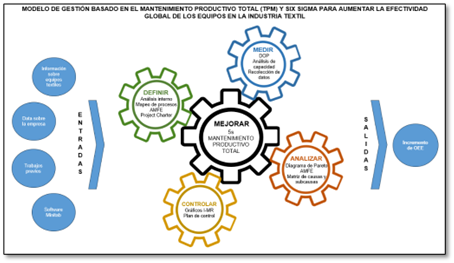El modelo desarrollado en el presente estudio se basa en la implementación de la herramienta TPM en conjunto con Six Sigma para incrementar la efectividad global de los equipos en una empresa textil. Este se representa gráficamente en la Figura 1.