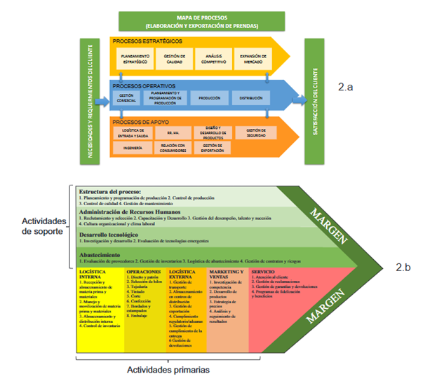A continuación, con la finalidad de conocer el funcionamiento de las partes interconectadas de la empresa y comprender cómo se relacionan las diferentes funciones y actividades, se desarrolló un mapeo de macroprocesos (Figura 2.a). Adicionalmente, para completar el análisis interno de la empresa, se identificó la cadena de valor. Esto permitió entender cómo se crea valor, identificar las oportunidades de mejora y determinar cómo se pueden optimizar los procesos del macroproceso de producción, que es el objeto de este estudio. El resultado se muestra en la Figura 2.b