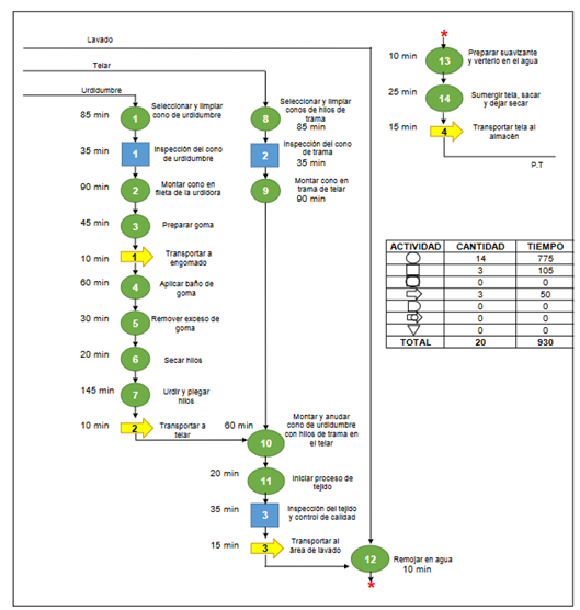 La fase de medición se inició con la elaboración de un diagrama de operaciones (DOP) para detallar y visualizar el proceso de tejeduría en la industria textil, con el propósito de comprender y optimizar este complejo proceso de fabricación. Dada la intrincada naturaleza de la tejeduría, desde la selección de los hilos hasta el control de calidad del producto terminado, era necesaria una representación clara y sistemática de las operaciones involucradas. El DOP permitió desglosar cada fase en etapas individuales y facilitó la identificación de posibles ineficiencias, cuellos de botella y oportunidades de mejora a lo largo del proceso, tal como se ilustra en la Figura 3.