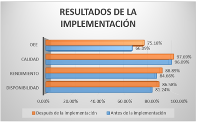 Tras la implementación de las 5S en integración con TPM, se obtuvieron resultados favorables. En la Figura 7 se muestran las mejoras en las variables de rendimiento, calidad y disponibilidad, que terminaron influyendo positivamente en el incremento de la efectividad global de los equipos.