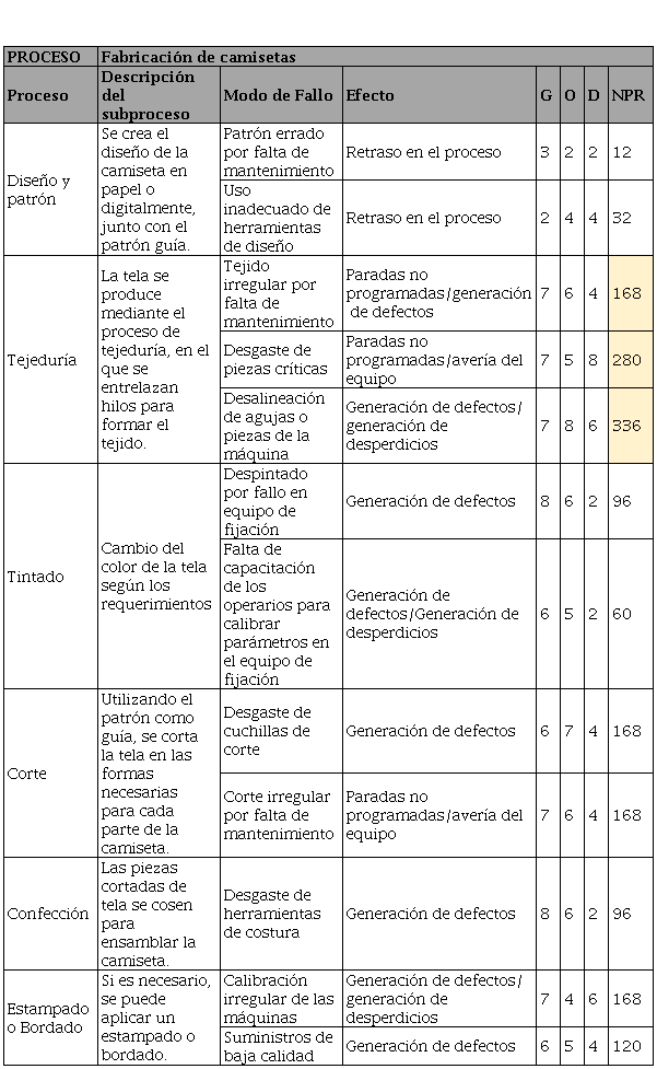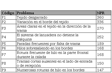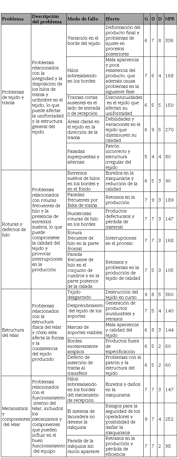 Como se puede apreciar en la Tabla 1, los modos de fallo asociados al proceso de tejeduría arrojaron un número de prioridad de riesgo (NPR) más alto, por lo que se escogió como área de trabajo. De este modo, tras haber completado la fase preliminar, el proyecto inició formalmente con el acta de constitución, en la que, entre otras cosas, se definió la problemática, los objetivos y el alcance del proyecto.