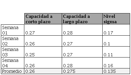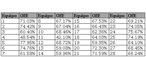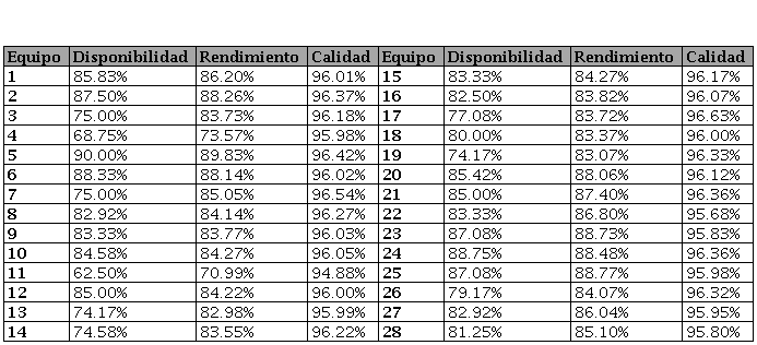 A continuación, se recolectaron datos acerca de la capacidad del proceso actual y el rendimiento, calidad y disponibilidad de los 28 equipos del área en un periodo de tres meses. Los valores promedio se muestran en las Tablas 2 y 3.