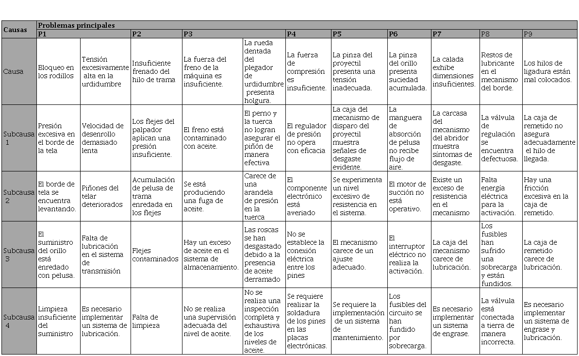 Posteriormente, se elaboró una matriz de causalidad para identificar causas y subcausas que contribuyen a la aparición de estos problemas. El resultado se muestra en la Tabla 7.