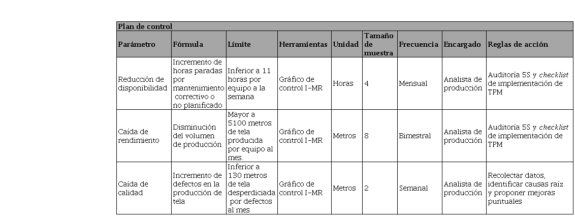 En la fase de control, después de implementar las mejoras, se llevó a cabo la recopilación de datos cinco veces por semana durante un periodo de tres semanas para evaluar su comportamiento y garantizar que se mantuvieran dentro de los límites de control. Con la finalidad de monitorear la estabilidad de los datos y actuar en caso de emergencia, se desarrolló el plan de control que se muestra en la Tabla 8.