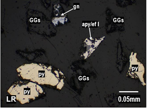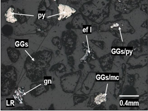 En una muestra representativa de la bocamina Esmeralda, a una granulometría de 100% +100 malla, se observó que la galena formó enlaces con pirita, gangas, cobres grises y esfalerita tipo I, todos los cuales se identificaron como moderadamente fáciles de liberar. A un tamaño de partícula de 100% −100 malla, la galena formó enlaces con arsenopirita, pirita, gangas y cobres grises. Entre ellos, los enlaces formados con las gangas, pirita y arsenopirita se identificaron como muy difíciles de liberar. Para un tamaño de partícula de 100% -200 malla, la galena formó enlaces con cobres grises, sulfosales de plomo, esfalerita tipo I, arsenopirita, estibina y calcopirita. Entre ellos, los enlaces formados con los cobres grises y los sulfosales de plomo se identificaron como moderadamente difícil y muy difícil de liberar, respectivamente.