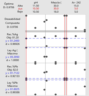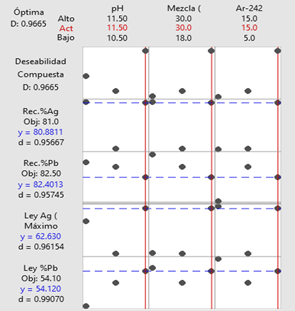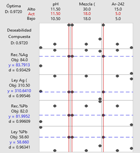 Se optimizaron las variables independientes de mayor contribución en el proceso de flotación de las tres bocaminas en estudio empleando Minitab 19. Los resultados para la optimización de parámetros de la bocamina Esmeralda indicaron una dosificación de 18 g/t de reactivo mezcla, 5 g/t de Ar-242 y un pH de 11.5. En la bocamina Orión los resultados de la optimización de variables fueron de 30 g/t de mezcla, 5 g/t de Ar-242 y un pH 10.5. Por último, los parámetros óptimos correspondiente a la flotación de minerales de la bocamina Hércules fueron de 15 g/t de Ar-242, 30 g/t de reactivo mezcla y un pH de 11.5. Los resultados y las gráficas de optimización de parámetros en la flotación de los minerales de las bocaminas Esmeralda, Orión y Hércules se representan en las figuras 5, 6, y 7.