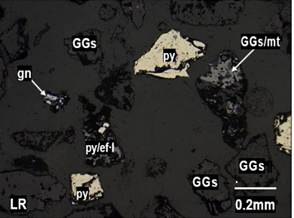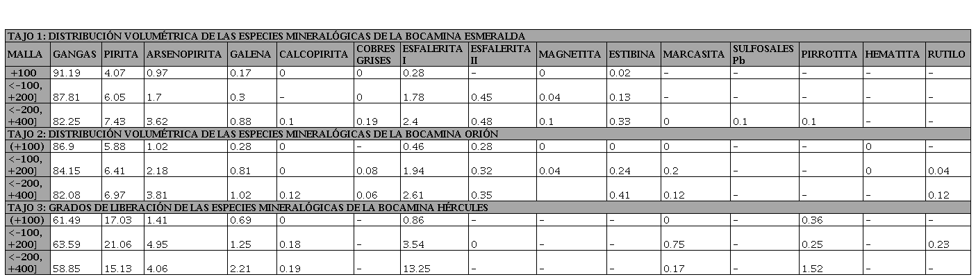 En la Tabla 2, se presentan los valores de distribución volumétrica de todos los minerales identificados en el microscopio óptico de luz reflejada para granulometrías de +100 malla, <−100, +200] malla, y <−200, +400] malla, encontrados en las tres bocaminas. Los datos demuestran que las especies se encuentran en mayor volumen a granulometrías más finas, lo que hace indicar que, en ese rango de tamaño de partícula, las especies se encuentran liberadas.