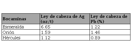 Los ensayos químicos de Pb para las distintas bocaminas se realizaron mediante el método de volumetría, mientras que la ley de plata se determinó por copelación. Los reportes del laboratorio determinaron que la bocamina Esmeralda reportó los valores más altos de plata, con una ley de 6.65 oz/t; los valores más bajos se reportaron en la bocamina Hércules con 1.12 oz/t. Por otro lado, los reportes de los análisis químicos de concentración de plomo revelaron que la bocamina Orión presentó una ley de 1.46%, es decir, los valores más altos con respecto a dicho metal. Los resultados de los ensayos químicos en las bocaminas de estudio se reportan a continuación en la Tabla 1.